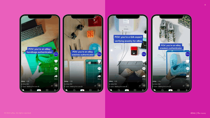 eBay wanted to increase consideration of the marketplace for luxury and fashion items while also conveying a free new authentication service. As part of a multi-platform approach, we created 6 first-person perspective videos from the POV of authenticators. This leveraged the native, trending TikTok format to both educate viewers and drive awareness of the program. The series featured real authenticators and real authentication steps. Overall results were impressive— we increased consideration by +2 points while also increasing trust in eBay.